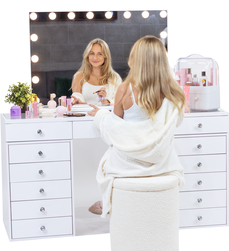 Chez Queen Room, chaque création est conçue pour transformer ta routine beauté en un moment d’exception. Nos miroirs et vanités allient technologie moderne (LED ajustable, haut-parleurs Bluetooth, rangement intelligent) et design intemporel, pour offrir bien plus qu’un meuble : un véritable sanctuaire personnel où chaque détail compte.
